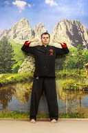 1 Исходное положение Чун Би. На вдохе руки через стороны расходятся, поднимаются вверх и на выдохе опускаются вниз останавливаясь на уровне низа живота. Нижнего дань тяня.